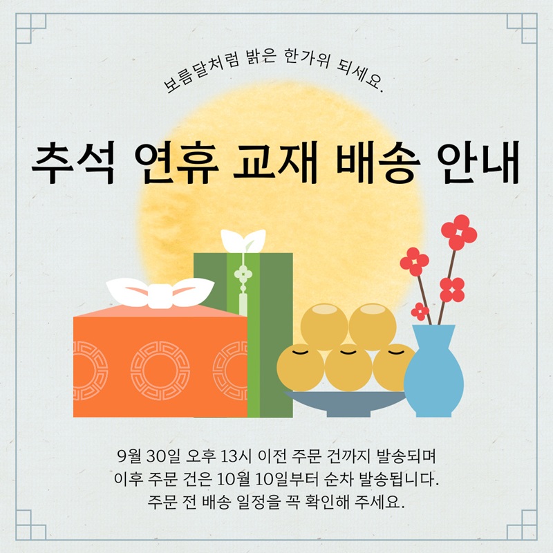 2025³â Ãß¼®±â°£ ±³Àç¹è¼ÛÁßÁö ¾È³»(9¿ù30ÀÏ~10¿ù12ÀÏ ¹è¼ÛX)